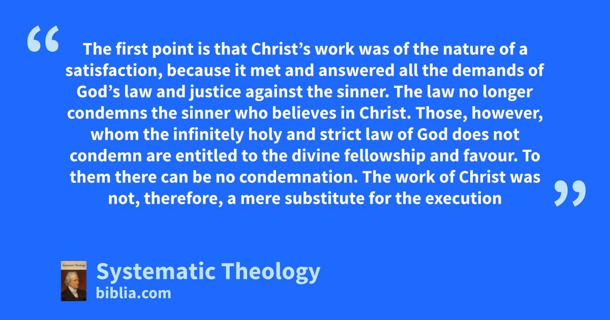 The first point is that Christ’s work was of the nature of a satisfaction, because it met and answered all the demands of God’s law and justice against the sinner. The law no longer condemns the sinner who believes in Christ. Those, however, whom the infinitely holy and strict law of God does not condemn are entitled to the divine fellowship and favour. To them there can be no condemnation. The work of Christ was not, therefore, a mere substitute for the execution