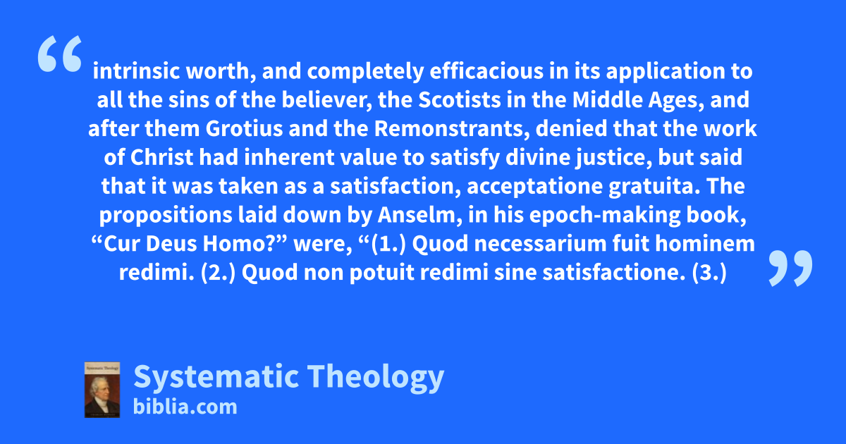 intrinsic worth, and completely efficacious in its application to all the sins of the believer, the Scotists in the Middle Ages, and after them Grotius and the Remonstrants, denied that the work of Christ had inherent value to satisfy divine justice, but said that it was taken as a satisfaction, acceptatione gratuita. The propositions laid down by Anselm, in his epoch-making book, “Cur Deus Homo?” were, “(1.) Quod necessarium fuit hominem redimi. (2.) Quod non potuit redimi sine satisfactione. (3.)