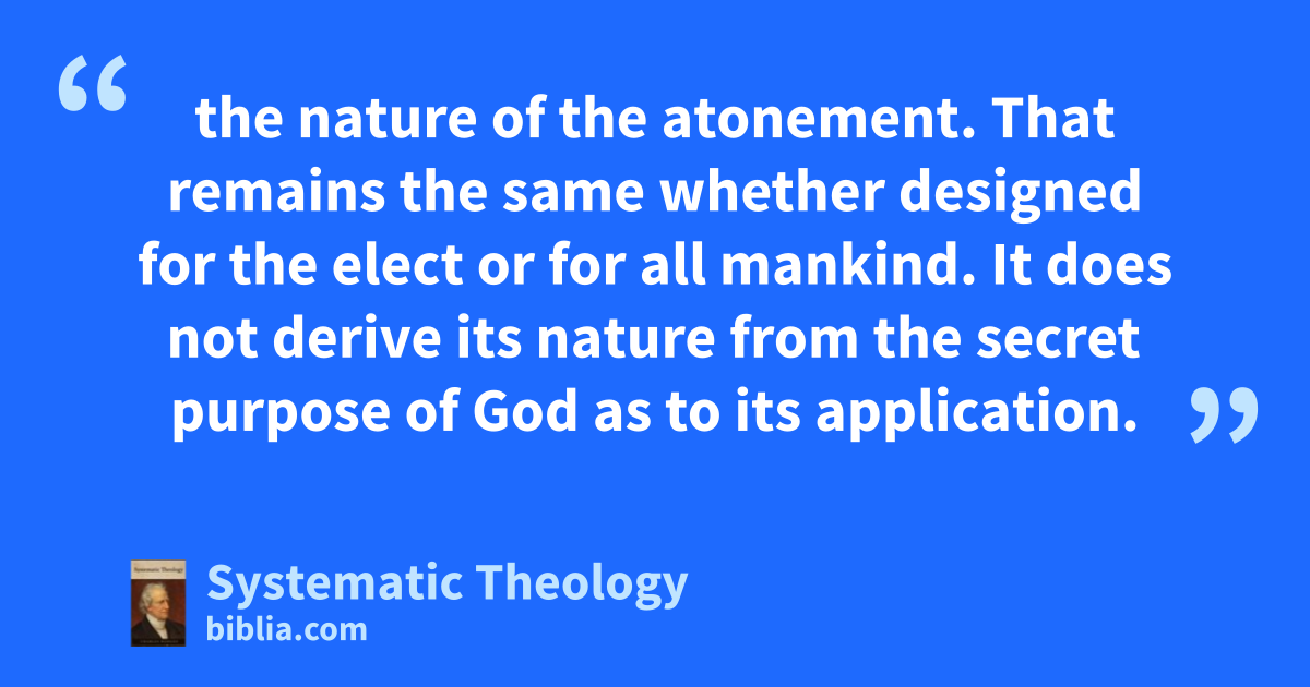 the nature of the atonement. That remains the same whether designed for the elect or for all mankind. It does not derive its nature from the secret purpose of God as to its application.