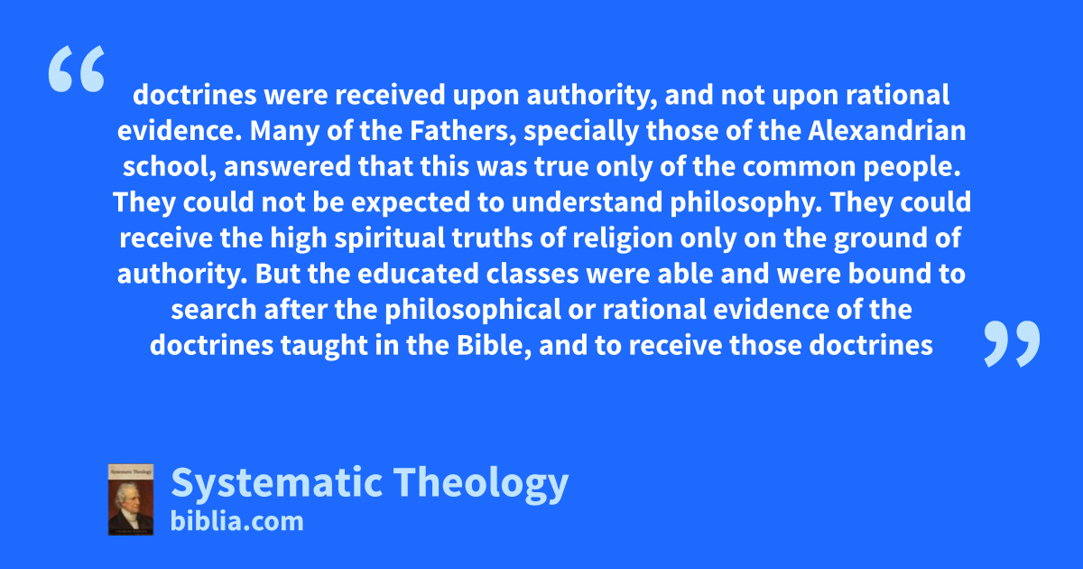 doctrines were received upon authority, and not upon rational evidence. Many of the Fathers, specially those of the Alexandrian school, answered that this was true only of the common people. They could not be expected to understand philosophy. They could receive the high spiritual truths of religion only on the ground of authority. But the educated classes were able and were bound to search after the philosophical or rational evidence of the doctrines taught in the Bible, and to receive those doctrines