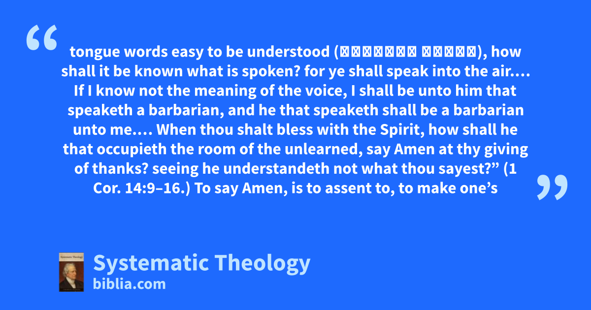 tongue words easy to be understood (εὔσημον λόγον), how shall it be known what is spoken? for ye shall speak into the air.… If I know not the meaning of the voice, I shall be unto him that speaketh a barbarian, and he that speaketh shall be a barbarian unto me.… When thou shalt bless with the Spirit, how shall he that occupieth the room of the unlearned, say Amen at thy giving of thanks? seeing he understandeth not what thou sayest?” (1 Cor. 14:9–16.) To say Amen, is to assent to, to make one’s