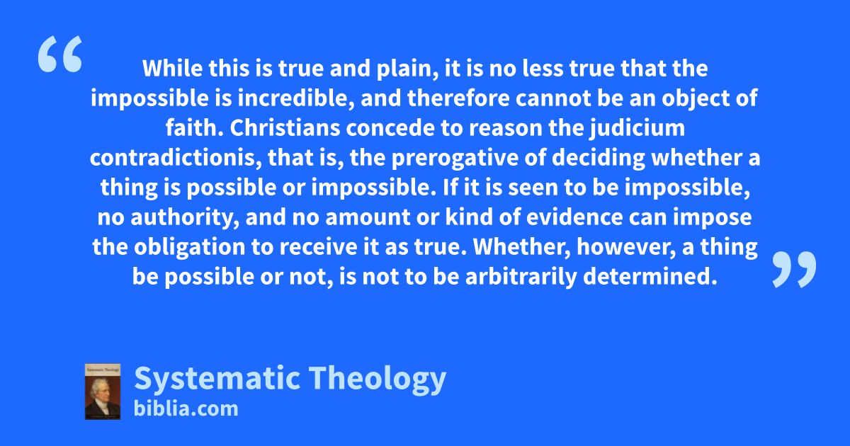 While this is true and plain, it is no less true that the impossible is incredible, and therefore cannot be an object of faith. Christians concede to reason the judicium contradictionis, that is, the prerogative of deciding whether a thing is possible or impossible. If it is seen to be impossible, no authority, and no amount or kind of evidence can impose the obligation to receive it as true. Whether, however, a thing be possible or not, is not to be arbitrarily determined.