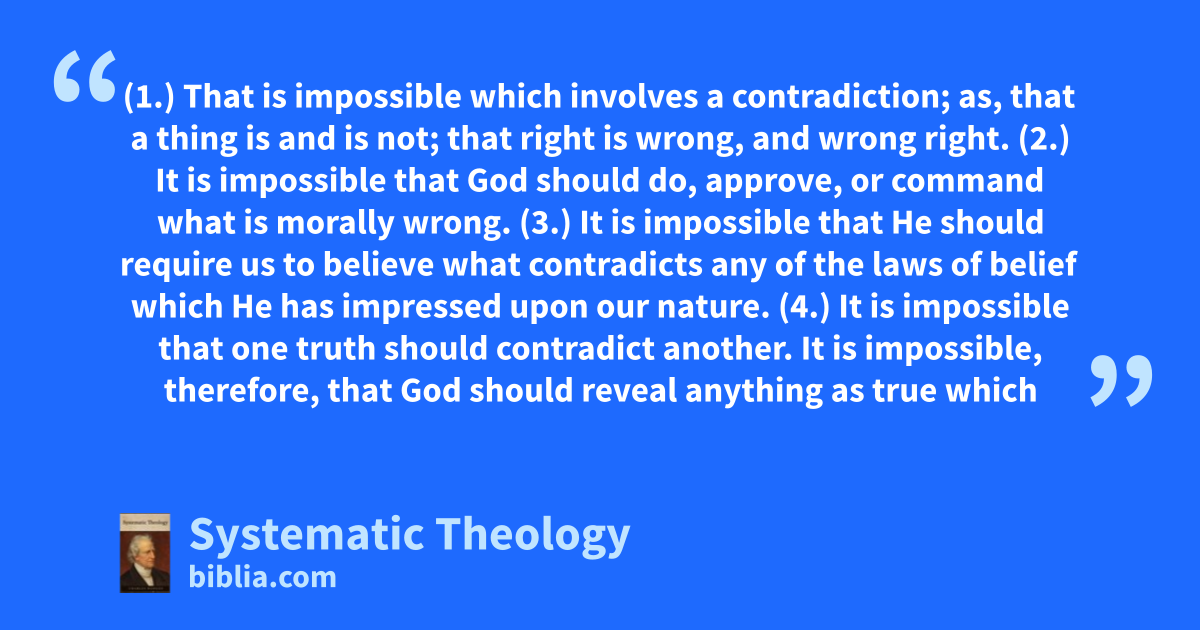 (1.) That is impossible which involves a contradiction; as, that a thing is and is not; that right is wrong, and wrong right. (2.) It is impossible that God should do, approve, or command what is morally wrong. (3.) It is impossible that He should require us to believe what contradicts any of the laws of belief which He has impressed upon our nature. (4.) It is impossible that one truth should contradict another. It is impossible, therefore, that God should reveal anything as true which