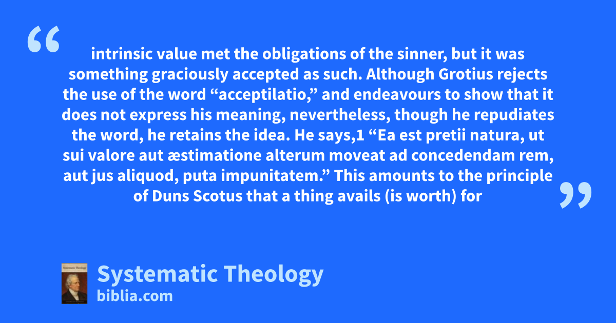 intrinsic value met the obligations of the sinner, but it was something graciously accepted as such. Although Grotius rejects the use of the word “acceptilatio,” and endeavours to show that it does not express his meaning, nevertheless, though he repudiates the word, he retains the idea. He says,1 “Ea est pretii natura, ut sui valore aut æstimatione alterum moveat ad concedendam rem, aut jus aliquod, puta impunitatem.” This amounts to the principle of Duns Scotus that a thing avails (is worth) for