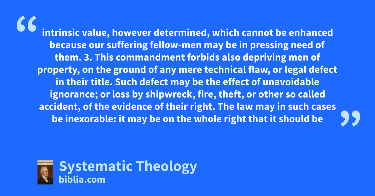 intrinsic value, however determined, which cannot be enhanced because our suffering fellow-men may be in pressing need of them. 3. This commandment forbids also depriving men of property, on the ground of any mere technical flaw, or legal defect in their title. Such defect may be the effect of unavoidable ignorance; or loss by shipwreck, fire, theft, or other so called accident, of the evidence of their right. The law may in such cases be inexorable: it may be on the whole right that it should be