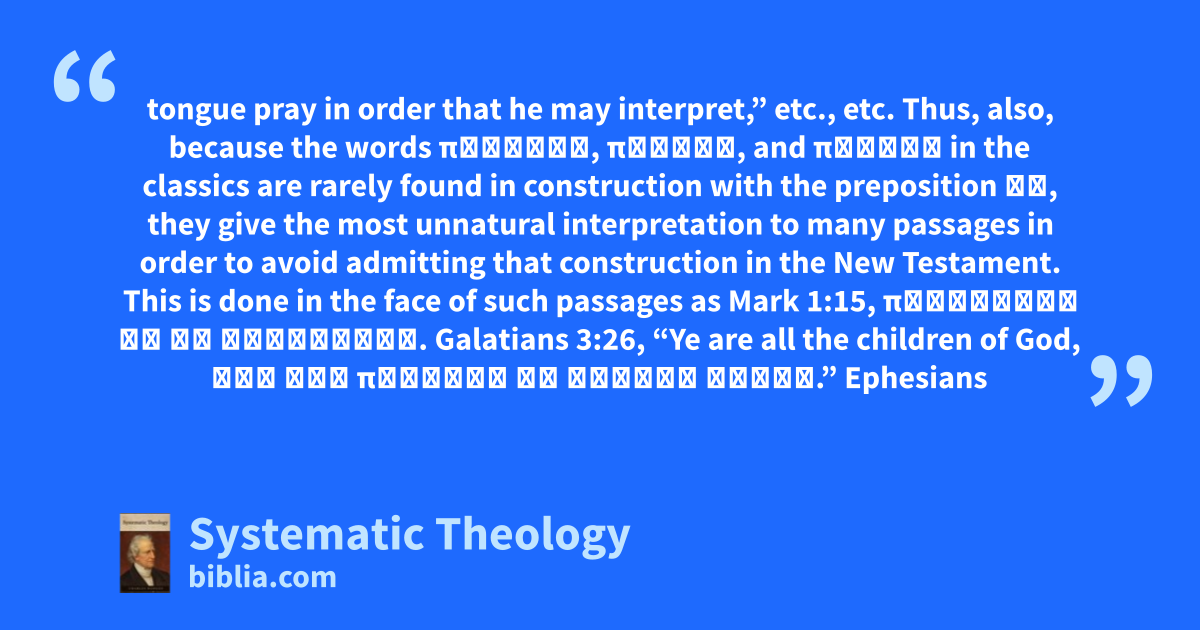tongue pray in order that he may interpret,” etc., etc. Thus, also, because the words πιστεύω, πίστις, and πιστός in the classics are rarely found in construction with the preposition ἐν, they give the most unnatural interpretation to many passages in order to avoid admitting that construction in the New Testament. This is done in the face of such passages as Mark 1:15, πιστεύετε ἐν τῷ εὐαγγελίῳ. Galatians 3:26, “Ye are all the children of God, διὰ τῆς πίστεως ἐν Χρισιῷ Ἰησοῦ.” Ephesians
