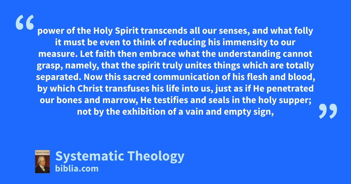 power of the Holy Spirit transcends all our senses, and what folly it must be even to think of reducing his immensity to our measure. Let faith then embrace what the understanding cannot grasp, namely, that the spirit truly unites things which are totally separated. Now this sacred communication of his flesh and blood, by which Christ transfuses his life into us, just as if He penetrated our bones and marrow, He testifies and seals in the holy supper; not by the exhibition of a vain and empty sign,