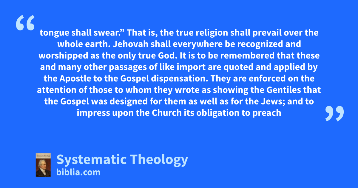tongue shall swear.” That is, the true religion shall prevail over the whole earth. Jehovah shall everywhere be recognized and worshipped as the only true God. It is to be remembered that these and many other passages of like import are quoted and applied by the Apostle to the Gospel dispensation. They are enforced on the attention of those to whom they wrote as showing the Gentiles that the Gospel was designed for them as well as for the Jews; and to impress upon the Church its obligation to preach