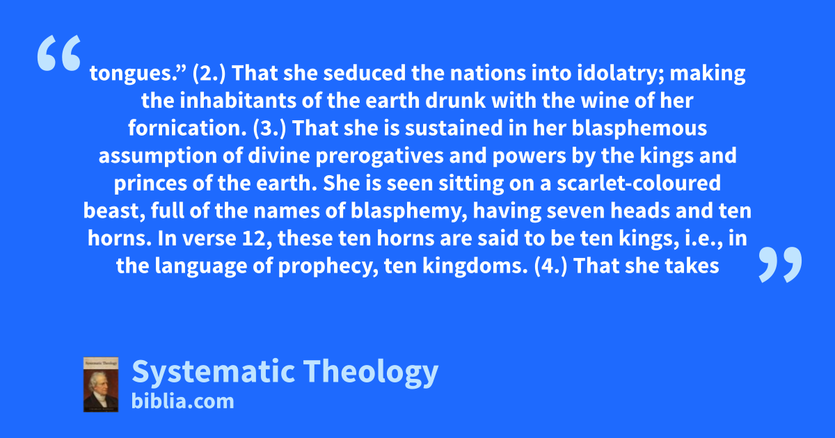 tongues.” (2.) That she seduced the nations into idolatry; making the inhabitants of the earth drunk with the wine of her fornication. (3.) That she is sustained in her blasphemous assumption of divine prerogatives and powers by the kings and princes of the earth. She is seen sitting on a scarlet-coloured beast, full of the names of blasphemy, having seven heads and ten horns. In verse 12, these ten horns are said to be ten kings, i.e., in the language of prophecy, ten kingdoms. (4.) That she takes