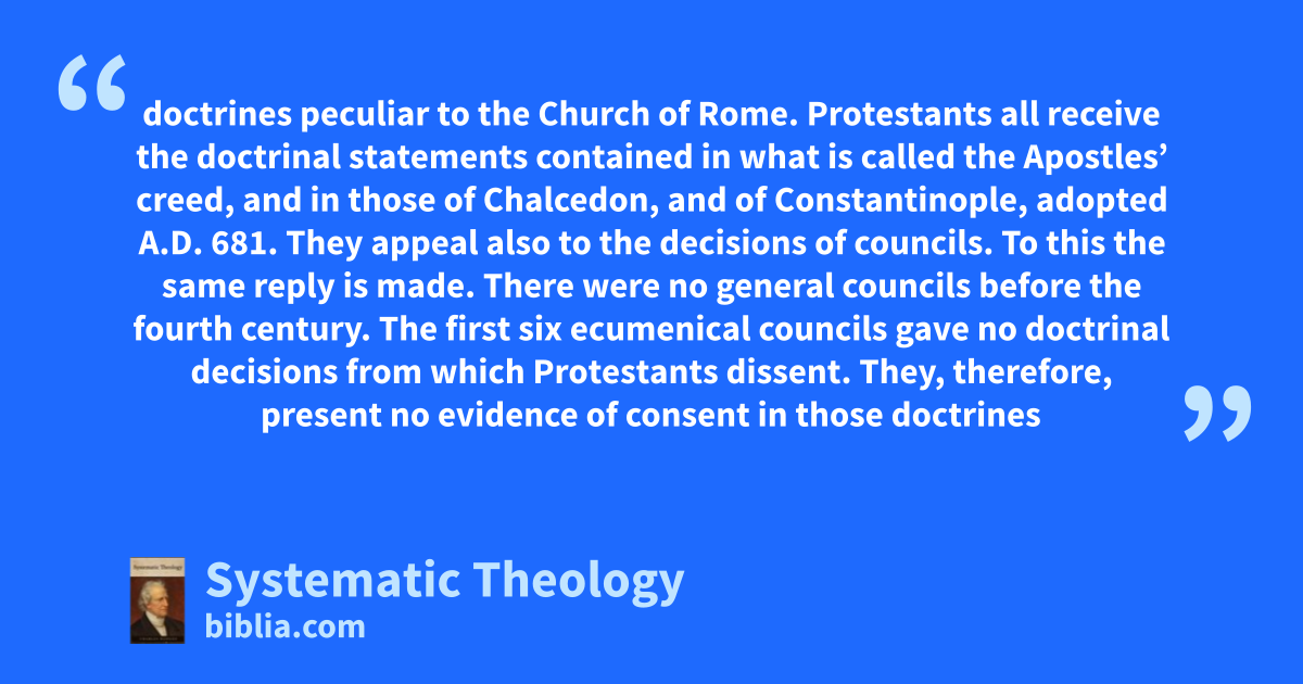 doctrines peculiar to the Church of Rome. Protestants all receive the doctrinal statements contained in what is called the Apostles’ creed, and in those of Chalcedon, and of Constantinople, adopted A.D. 681. They appeal also to the decisions of councils. To this the same reply is made. There were no general councils before the fourth century. The first six ecumenical councils gave no doctrinal decisions from which Protestants dissent. They, therefore, present no evidence of consent in those doctrines