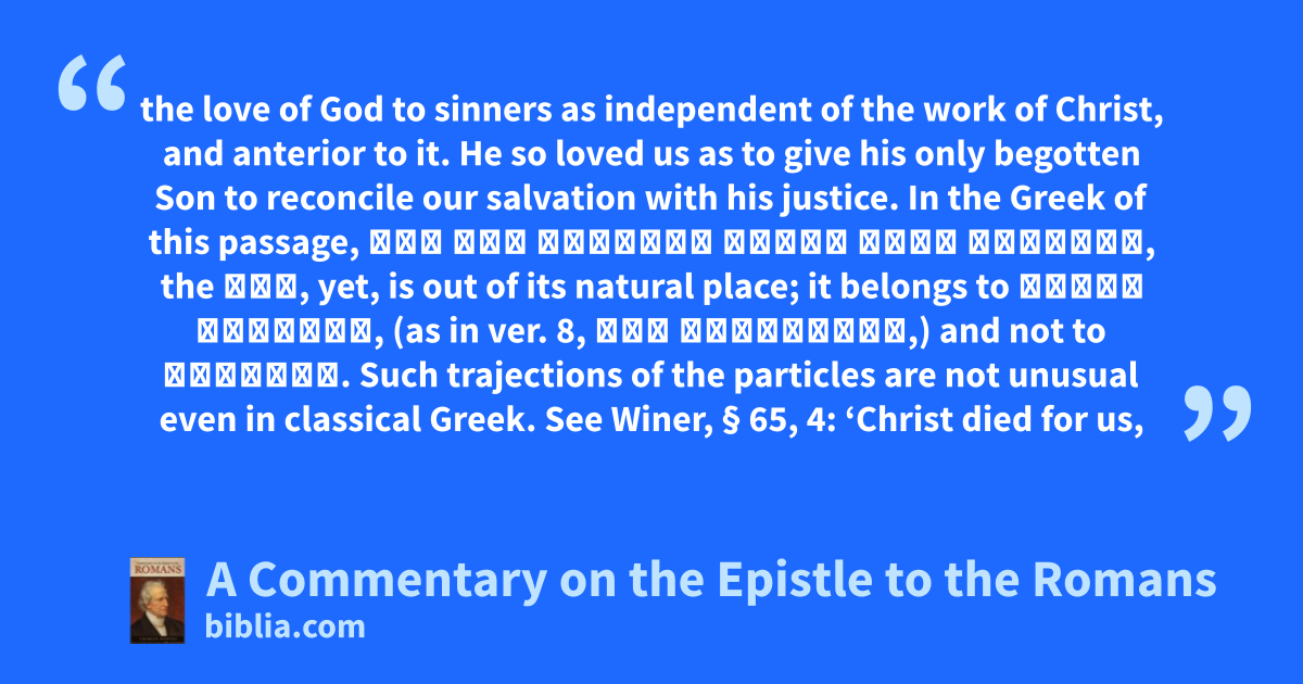 the love of God to sinners as independent of the work of Christ, and anterior to it. He so loved us as to give his only begotten Son to reconcile our salvation with his justice. In the Greek of this passage, ἔτι γὰρ Χριστὸς ὄντων ἡμῶν ἀσθενῶν, the ἔτι, yet, is out of its natural place; it belongs to ὄντων ἀσθενῶν, (as in ver. 8, ἔτι ἁμαρτωλῶν,) and not to Χριστός. Such trajections of the particles are not unusual even in classical Greek. See Winer, § 65, 4: ‘Christ died for us,