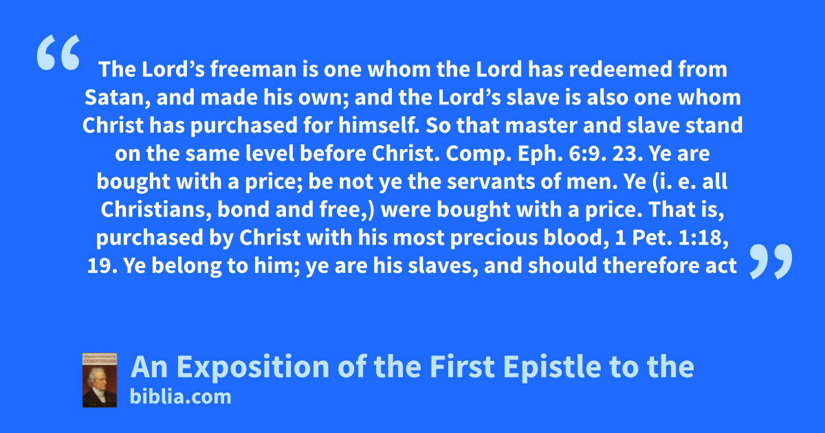 The Lord’s freeman is one whom the Lord has redeemed from Satan, and made his own; and the Lord’s slave is also one whom Christ has purchased for himself. So that master and slave stand on the same level before Christ. Comp. Eph. 6:9. 23. Ye are bought with a price; be not ye the servants of men. Ye (i. e. all Christians, bond and free,) were bought with a price. That is, purchased by Christ with his most precious blood, 1 Pet. 1:18, 19. Ye belong to him; ye are his slaves, and should therefore act