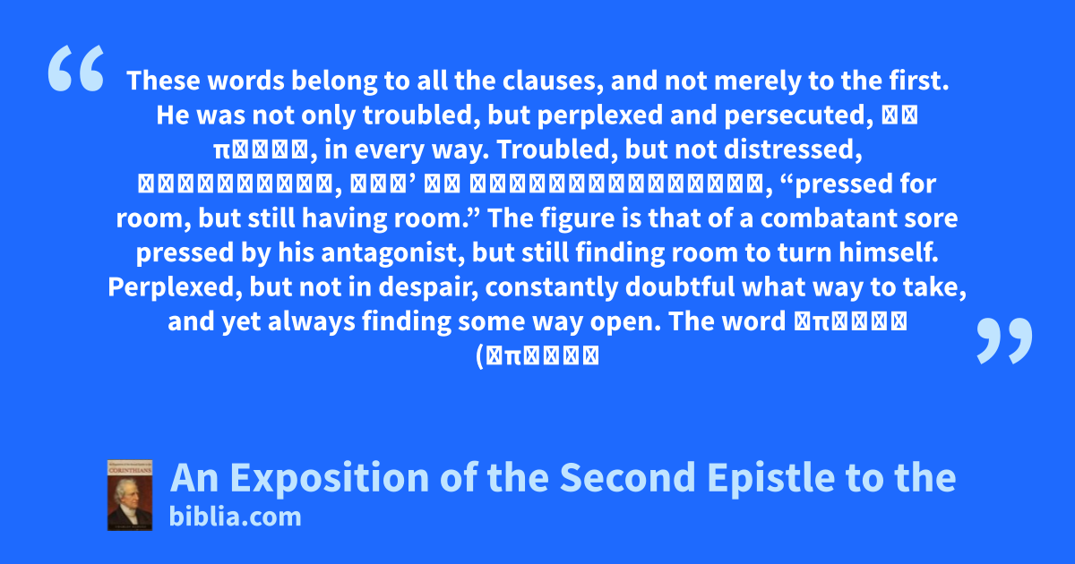 These words belong to all the clauses, and not merely to the first. He was not only troubled, but perplexed and persecuted, ἐν παντί, in every way. Troubled, but not distressed, θλιβόμενοι, ἀλλʼ οὐ στενοχωρούμενοι, “pressed for room, but still having room.” The figure is that of a combatant sore pressed by his antagonist, but still finding room to turn himself. Perplexed, but not in despair, constantly doubtful what way to take, and yet always finding some way open. The word ἀπορέω (ἄπορός