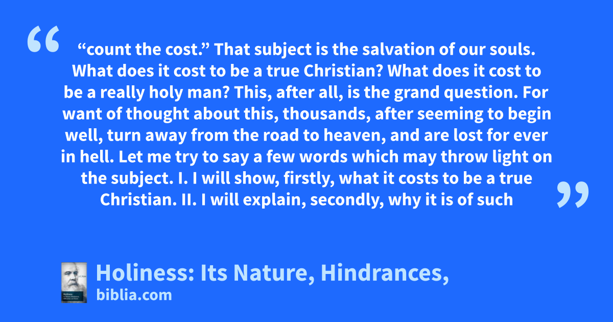 “count the cost.” That subject is the salvation of our souls. What does it cost to be a true Christian? What does it cost to be a really holy man? This, after all, is the grand question. For want of thought about this, thousands, after seeming to begin well, turn away from the road to heaven, and are lost for ever in hell. Let me try to say a few words which may throw light on the subject. I. I will show, firstly, what it costs to be a true Christian. II. I will explain, secondly, why it is of such