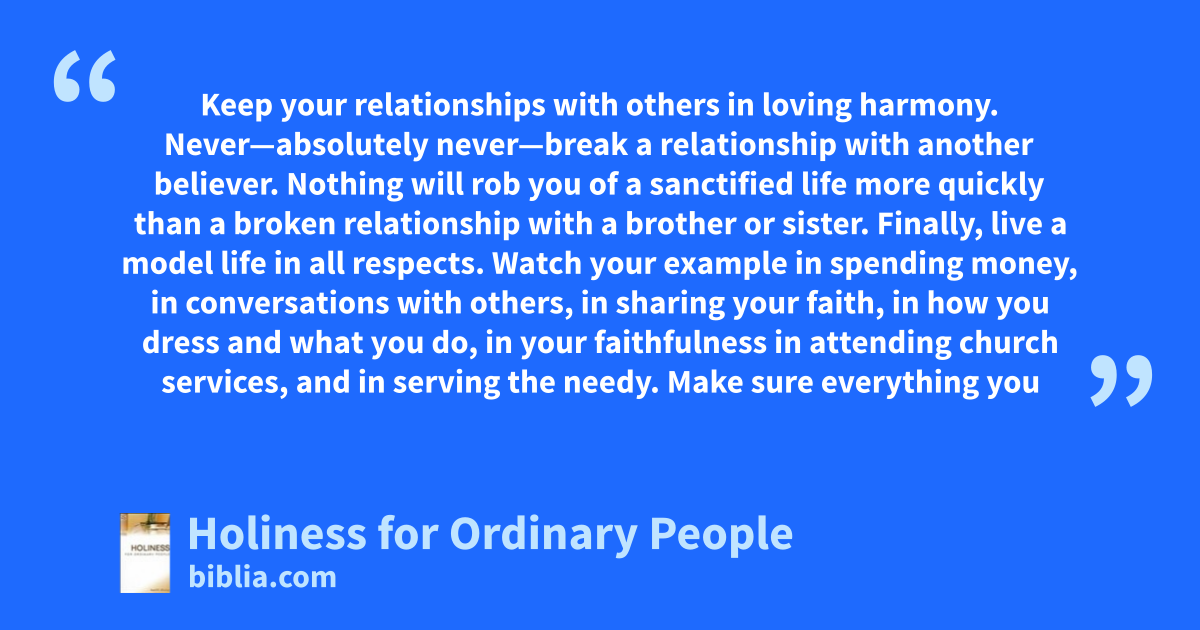 Keep your relationships with others in loving harmony. Never—absolutely never—break a relationship with another believer. Nothing will rob you of a sanctified life more quickly than a broken relationship with a brother or sister. Finally, live a model life in all respects. Watch your example in spending money, in conversations with others, in sharing your faith, in how you dress and what you do, in your faithfulness in attending church services, and in serving the needy. Make sure everything you
