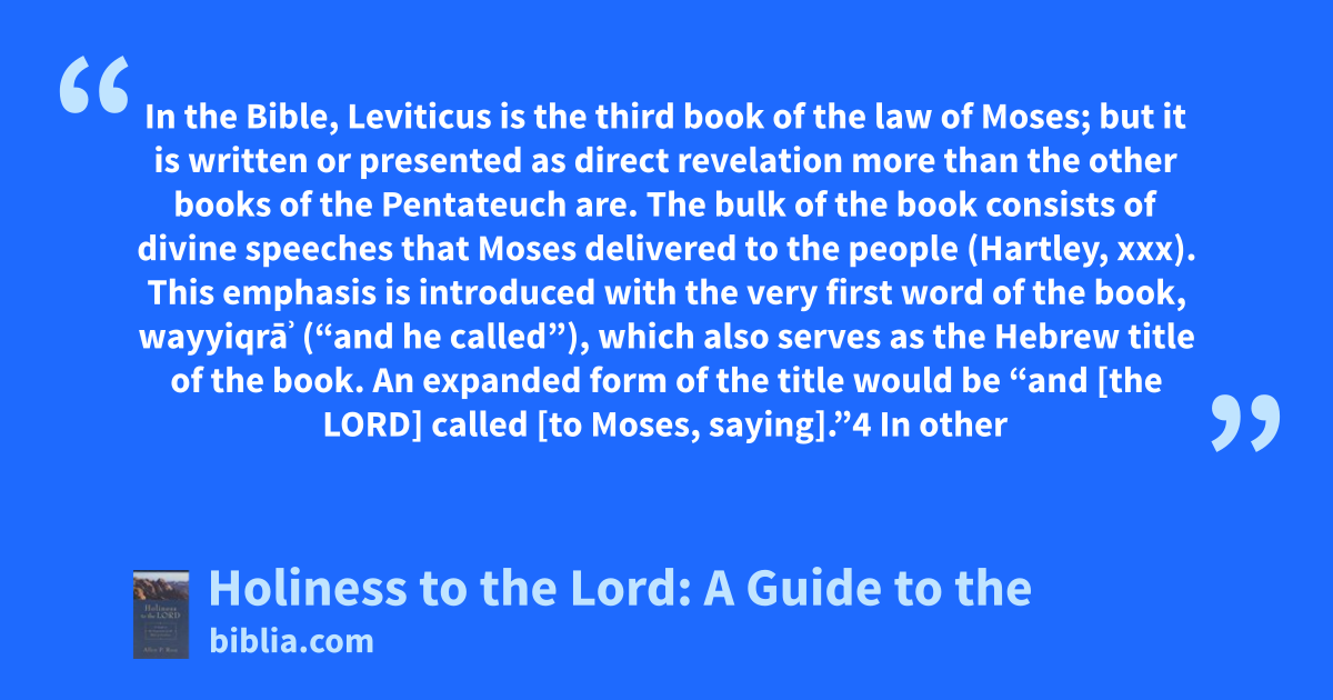 In the Bible, Leviticus is the third book of the law of Moses; but it is written or presented as direct revelation more than the other books of the Pentateuch are. The bulk of the book consists of divine speeches that Moses delivered to the people (Hartley, xxx). This emphasis is introduced with the very first word of the book, wayyiqrāʾ (“and he called”), which also serves as the Hebrew title of the book. An expanded form of the title would be “and [the LORD] called [to Moses, saying].”4 In other