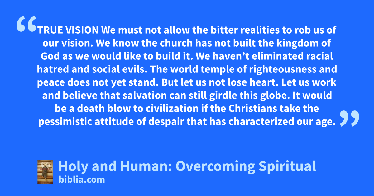 TRUE VISION We must not allow the bitter realities to rob us of our vision. We know the church has not built the kingdom of God as we would like to build it. We haven’t eliminated racial hatred and social evils. The world temple of righteousness and peace does not yet stand. But let us not lose heart. Let us work and believe that salvation can still girdle this globe. It would be a death blow to civilization if the Christians take the pessimistic attitude of despair that has characterized our age.