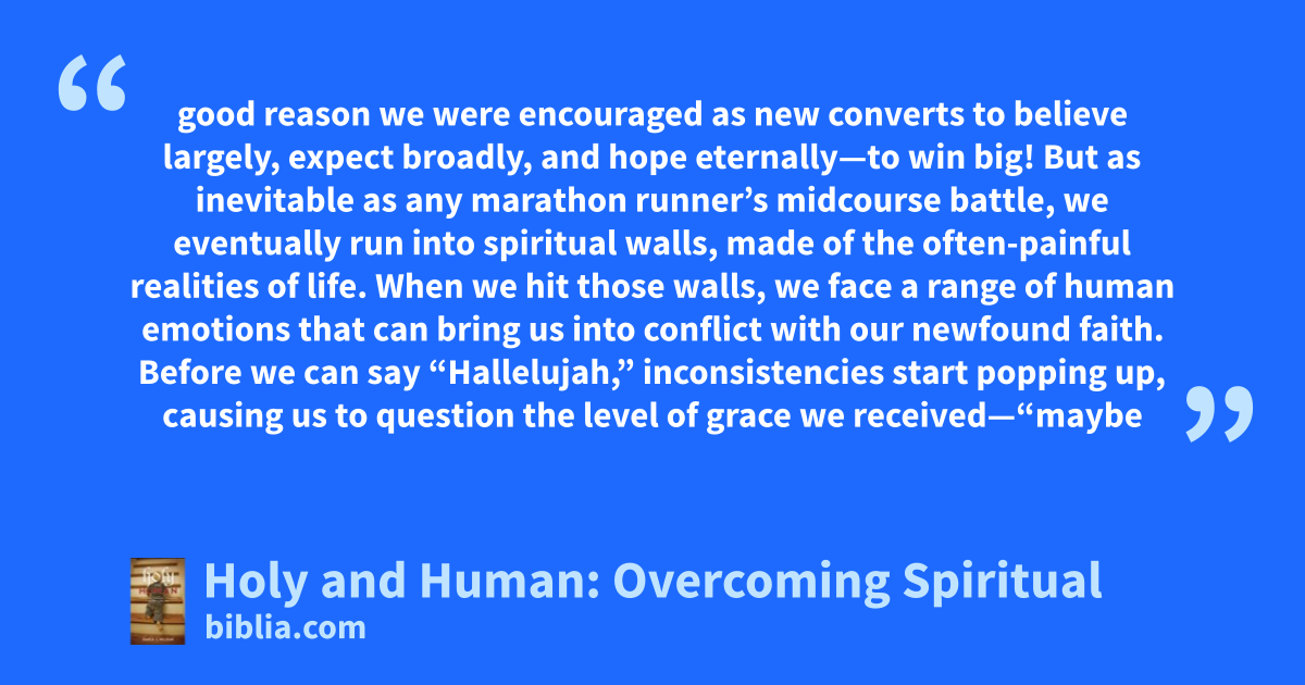 good reason we were encouraged as new converts to believe largely, expect broadly, and hope eternally—to win big! But as inevitable as any marathon runner’s midcourse battle, we eventually run into spiritual walls, made of the often-painful realities of life. When we hit those walls, we face a range of human emotions that can bring us into conflict with our newfound faith. Before we can say “Hallelujah,” inconsistencies start popping up, causing us to question the level of grace we received—“maybe