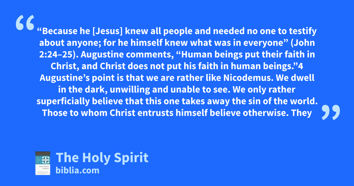 “Because he [Jesus] knew all people and needed no one to testify about anyone; for he himself knew what was in everyone” (John 2:24–25). Augustine comments, “Human beings put their faith in Christ, and Christ does not put his faith in human beings.”4 Augustine’s point is that we are rather like Nicodemus. We dwell in the dark, unwilling and unable to see. We only rather superficially believe that this one takes away the sin of the world. Those to whom Christ entrusts himself believe otherwise. They