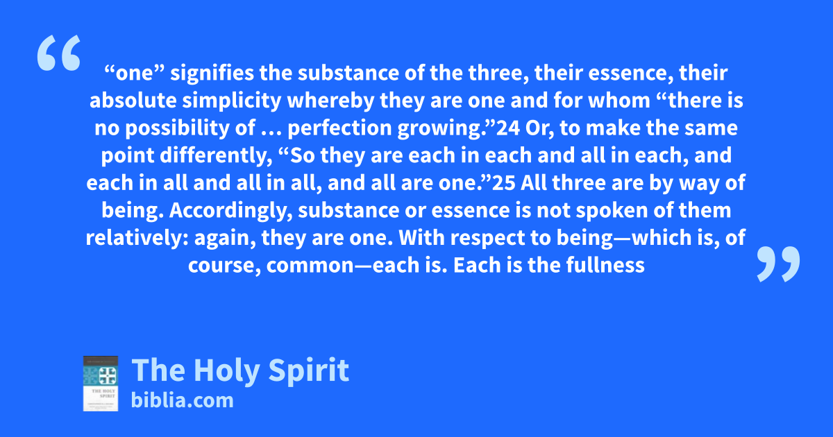 “one” signifies the substance of the three, their essence, their absolute simplicity whereby they are one and for whom “there is no possibility of … perfection growing.”24 Or, to make the same point differently, “So they are each in each and all in each, and each in all and all in all, and all are one.”25 All three are by way of being. Accordingly, substance or essence is not spoken of them relatively: again, they are one. With respect to being—which is, of course, common—each is. Each is the fullness