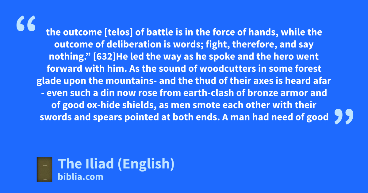 the outcome [telos] of battle is in the force of hands, while the outcome of deliberation is words; fight, therefore, and say nothing.” [632]He led the way as he spoke and the hero went forward with him. As the sound of woodcutters in some forest glade upon the mountains- and the thud of their axes is heard afar - even such a din now rose from earth-clash of bronze armor and of good ox-hide shields, as men smote each other with their swords and spears pointed at both ends. A man had need of good