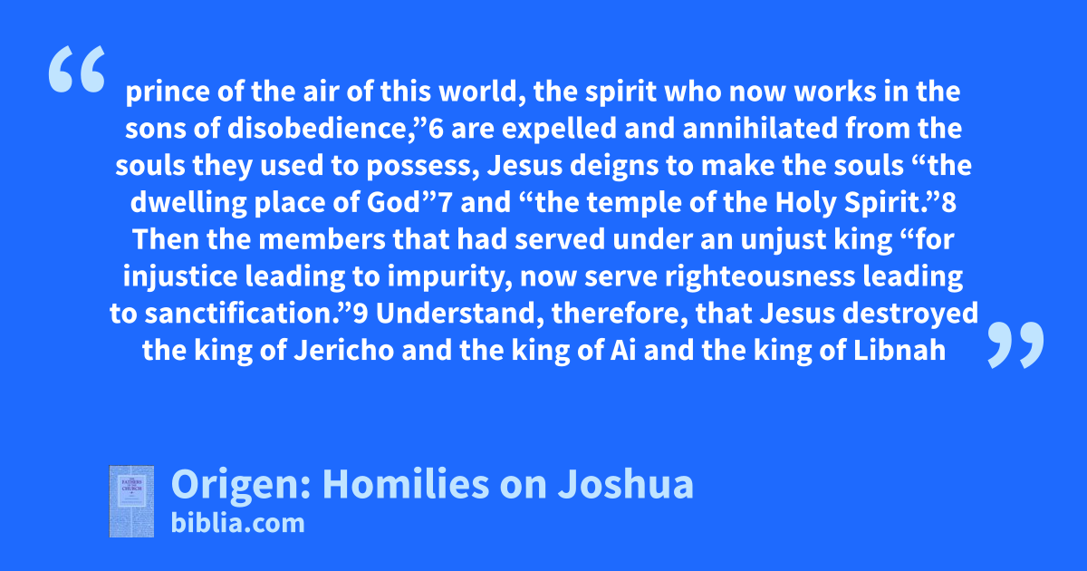 prince of the air of this world, the spirit who now works in the sons of disobedience,”6 are expelled and annihilated from the souls they used to possess, Jesus deigns to make the souls “the dwelling place of God”7 and “the temple of the Holy Spirit.”8 Then the members that had served under an unjust king “for injustice leading to impurity, now serve righteousness leading to sanctification.”9 Understand, therefore, that Jesus destroyed the king of Jericho and the king of Ai and the king of Libnah