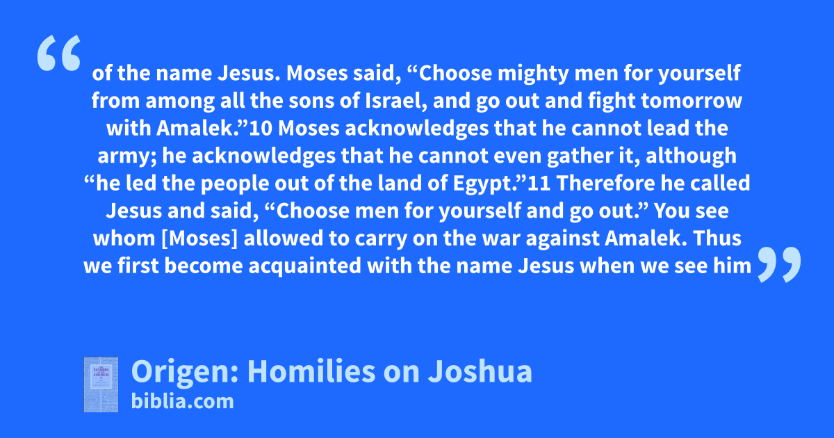 of the name Jesus. Moses said, “Choose mighty men for yourself from among all the sons of Israel, and go out and fight tomorrow with Amalek.”10 Moses acknowledges that he cannot lead the army; he acknowledges that he cannot even gather it, although “he led the people out of the land of Egypt.”11 Therefore he called Jesus and said, “Choose men for yourself and go out.” You see whom [Moses] allowed to carry on the war against Amalek. Thus we first become acquainted with the name Jesus when we see him