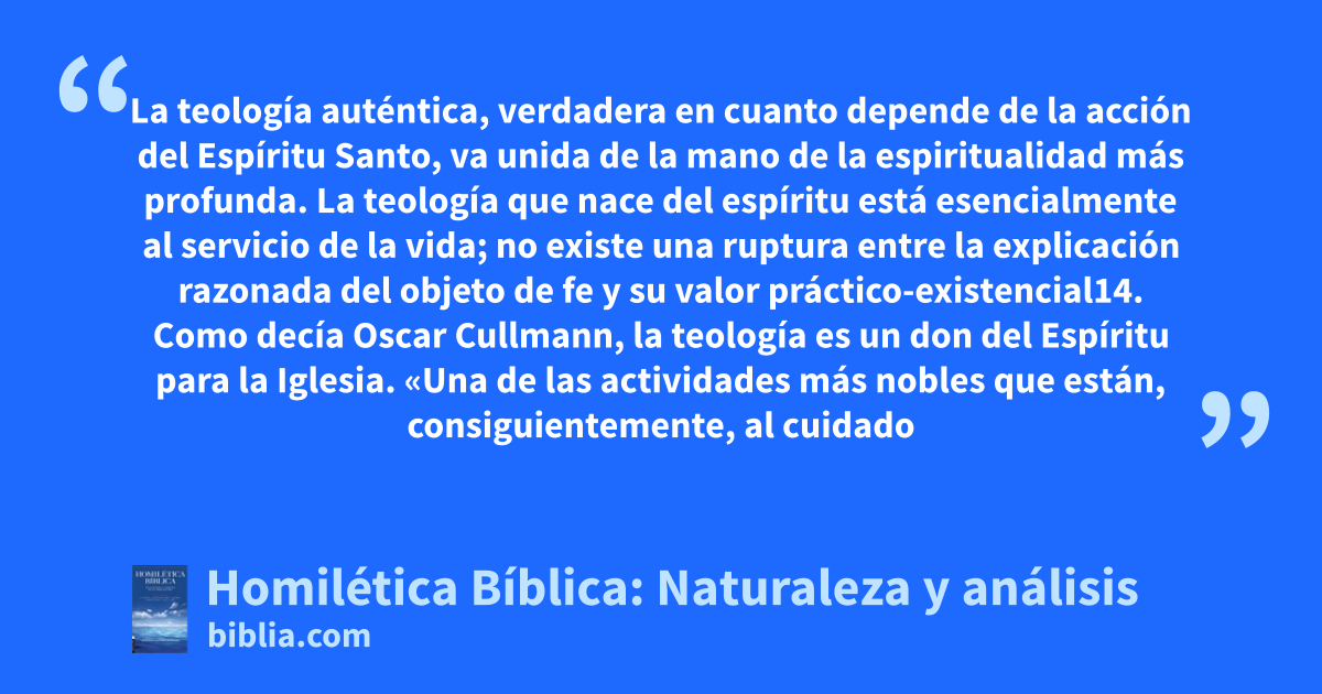 La teología auténtica, verdadera en cuanto depende de la acción del Espíritu Santo, va unida de la mano de la espiritualidad más profunda. La teología que nace del espíritu está esencialmente al servicio de la vida; no existe una ruptura entre la explicación razonada del objeto de fe y su valor práctico-existencial14. Como decía Oscar Cullmann, la teología es un don del Espíritu para la Iglesia. «Una de las actividades más nobles que están, consiguientemente, al cuidado