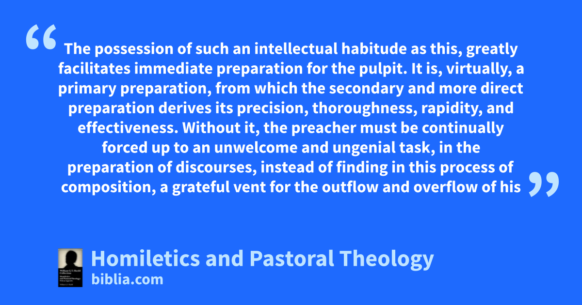 The possession of such an intellectual habitude as this, greatly facilitates immediate preparation for the pulpit. It is, virtually, a primary preparation, from which the secondary and more direct preparation derives its precision, thoroughness, rapidity, and effectiveness. Without it, the preacher must be continually forced up to an unwelcome and ungenial task, in the preparation of discourses, instead of finding in this process of composition, a grateful vent for the outflow and overflow of his