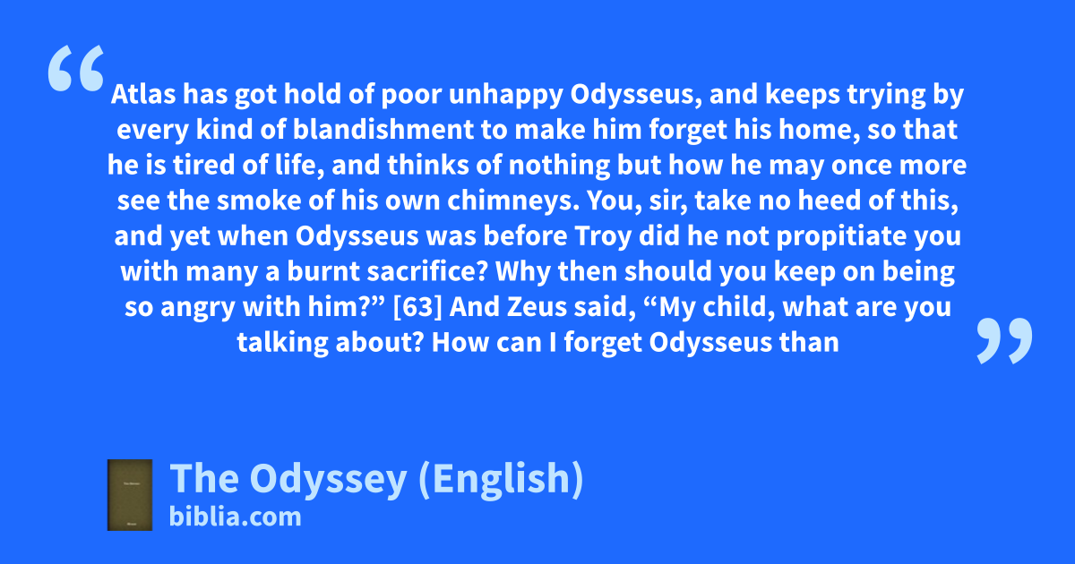 Atlas has got hold of poor unhappy Odysseus, and keeps trying by every kind of blandishment to make him forget his home, so that he is tired of life, and thinks of nothing but how he may once more see the smoke of his own chimneys. You, sir, take no heed of this, and yet when Odysseus was before Troy did he not propitiate you with many a burnt sacrifice? Why then should you keep on being so angry with him?” [63] And Zeus said, “My child, what are you talking about? How can I forget Odysseus than