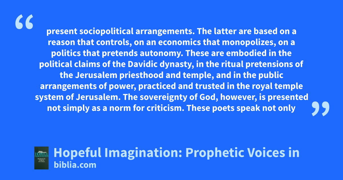 present sociopolitical arrangements. The latter are based on a reason that controls, on an economics that monopolizes, on a politics that pretends autonomy. These are embodied in the political claims of the Davidic dynasty, in the ritual pretensions of the Jerusalem priesthood and temple, and in the public arrangements of power, practiced and trusted in the royal temple system of Jerusalem. The sovereignty of God, however, is presented not simply as a norm for criticism. These poets speak not only