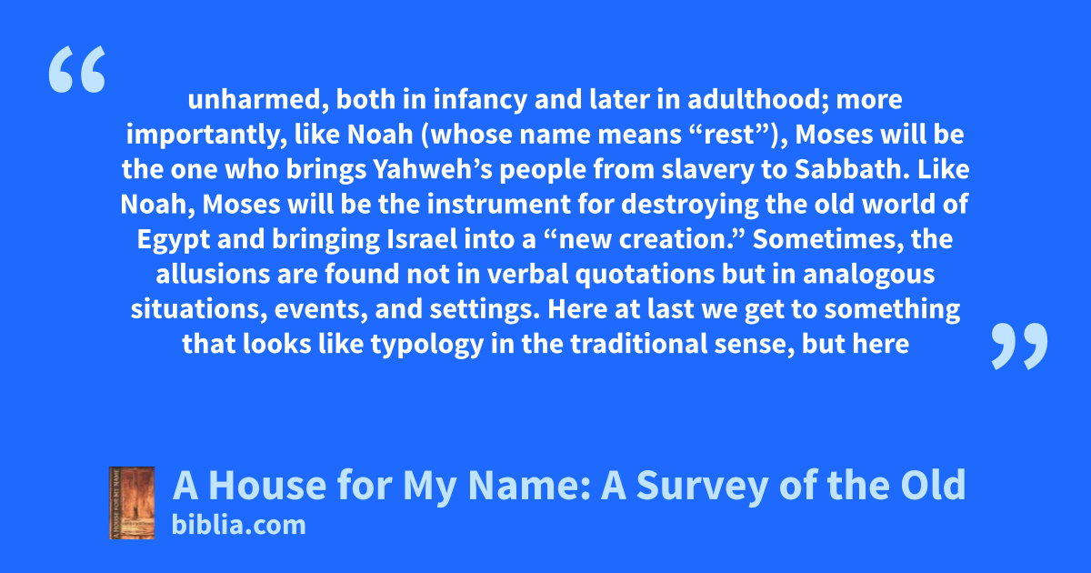 unharmed, both in infancy and later in adulthood; more importantly, like Noah (whose name means “rest”), Moses will be the one who brings Yahweh’s people from slavery to Sabbath. Like Noah, Moses will be the instrument for destroying the old world of Egypt and bringing Israel into a “new creation.” Sometimes, the allusions are found not in verbal quotations but in analogous situations, events, and settings. Here at last we get to something that looks like typology in the traditional sense, but here