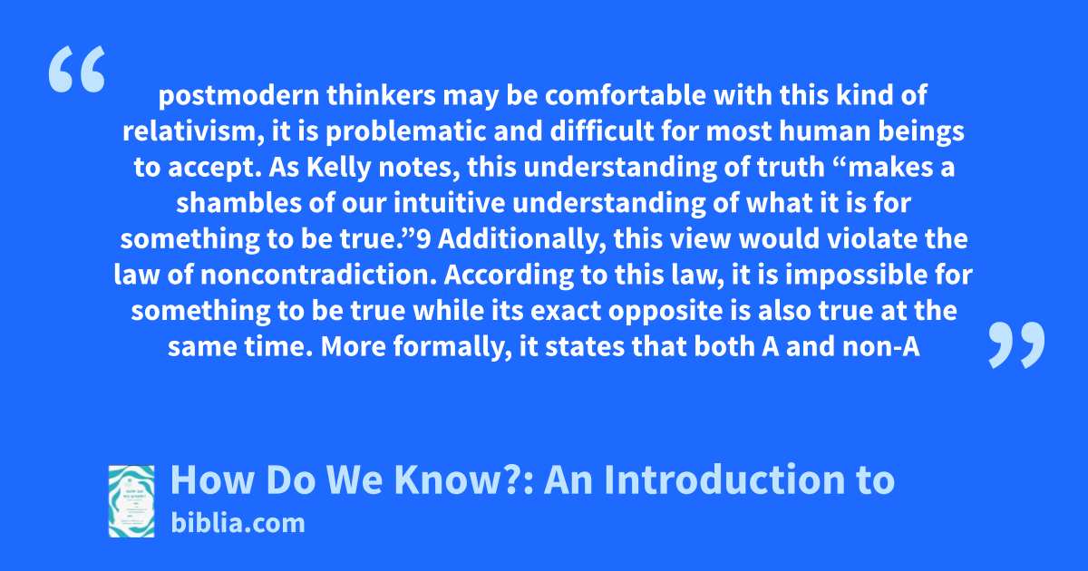 postmodern thinkers may be comfortable with this kind of relativism, it is problematic and difficult for most human beings to accept. As Kelly notes, this understanding of truth “makes a shambles of our intuitive understanding of what it is for something to be true.”9 Additionally, this view would violate the law of noncontradiction. According to this law, it is impossible for something to be true while its exact opposite is also true at the same time. More formally, it states that both A and non-A