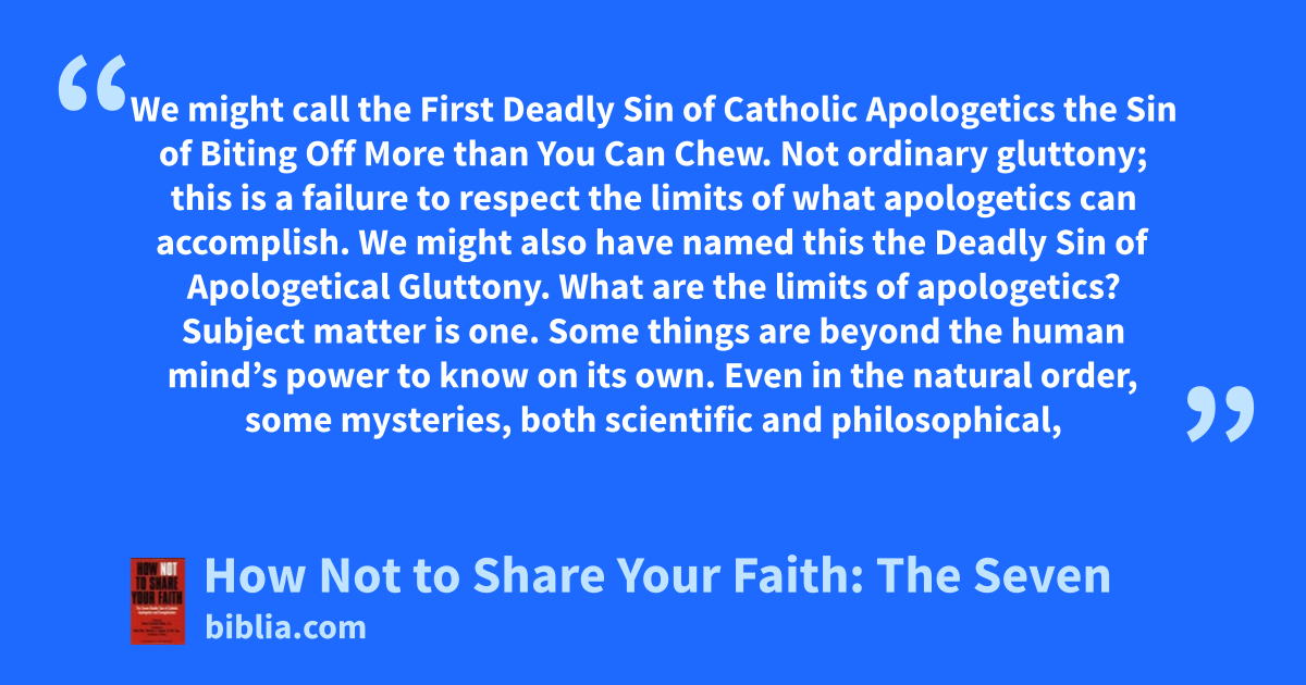We might call the First Deadly Sin of Catholic Apologetics the Sin of Biting Off More than You Can Chew. Not ordinary gluttony; this is a failure to respect the limits of what apologetics can accomplish. We might also have named this the Deadly Sin of Apologetical Gluttony. What are the limits of apologetics? Subject matter is one. Some things are beyond the human mind’s power to know on its own. Even in the natural order, some mysteries, both scientific and philosophical,