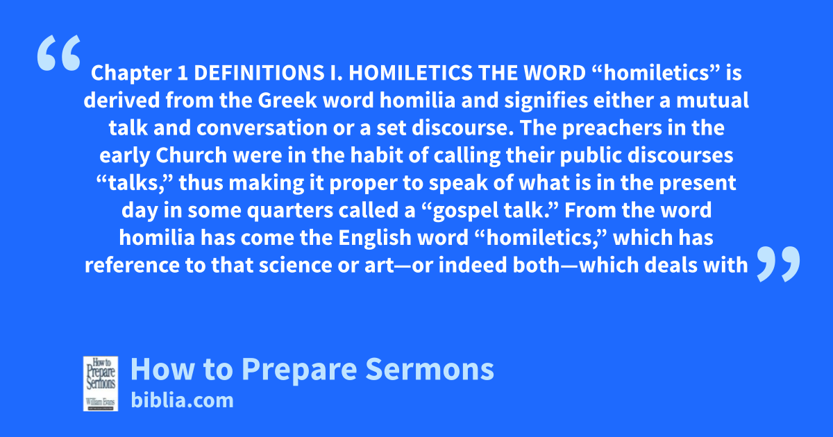 Chapter 1 DEFINITIONS I. HOMILETICS THE WORD “homiletics” is derived from the Greek word homilia and signifies either a mutual talk and conversation or a set discourse. The preachers in the early Church were in the habit of calling their public discourses “talks,” thus making it proper to speak of what is in the present day in some quarters called a “gospel talk.” From the word homilia has come the English word “homiletics,” which has reference to that science or art—or indeed both—which deals with