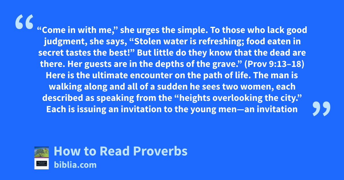 “Come in with me,” she urges the simple. To those who lack good judgment, she says, “Stolen water is refreshing; food eaten in secret tastes the best!” But little do they know that the dead are there. Her guests are in the depths of the grave.” (Prov 9:13–18) Here is the ultimate encounter on the path of life. The man is walking along and all of a sudden he sees two women, each described as speaking from the “heights overlooking the city.” Each is issuing an invitation to the young men—an invitation