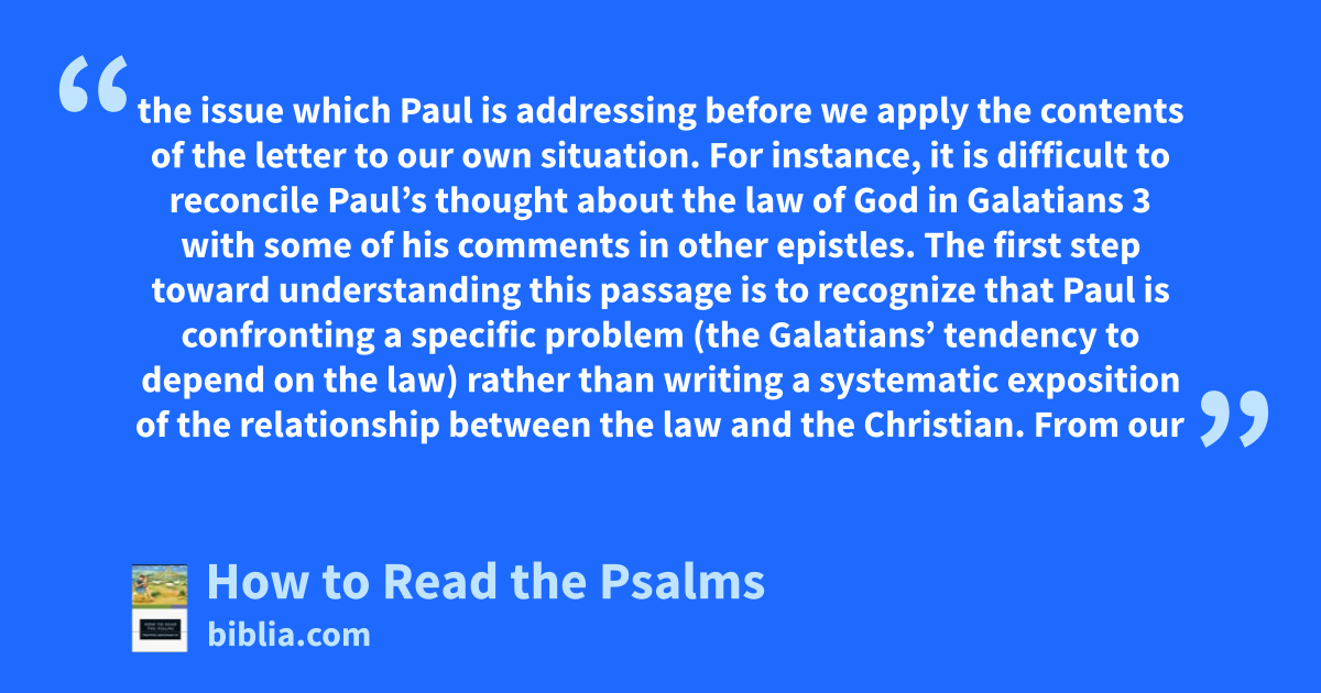 the issue which Paul is addressing before we apply the contents of the letter to our own situation. For instance, it is difficult to reconcile Paul’s thought about the law of God in Galatians 3 with some of his comments in other epistles. The first step toward understanding this passage is to recognize that Paul is confronting a specific problem (the Galatians’ tendency to depend on the law) rather than writing a systematic exposition of the relationship between the law and the Christian. From our