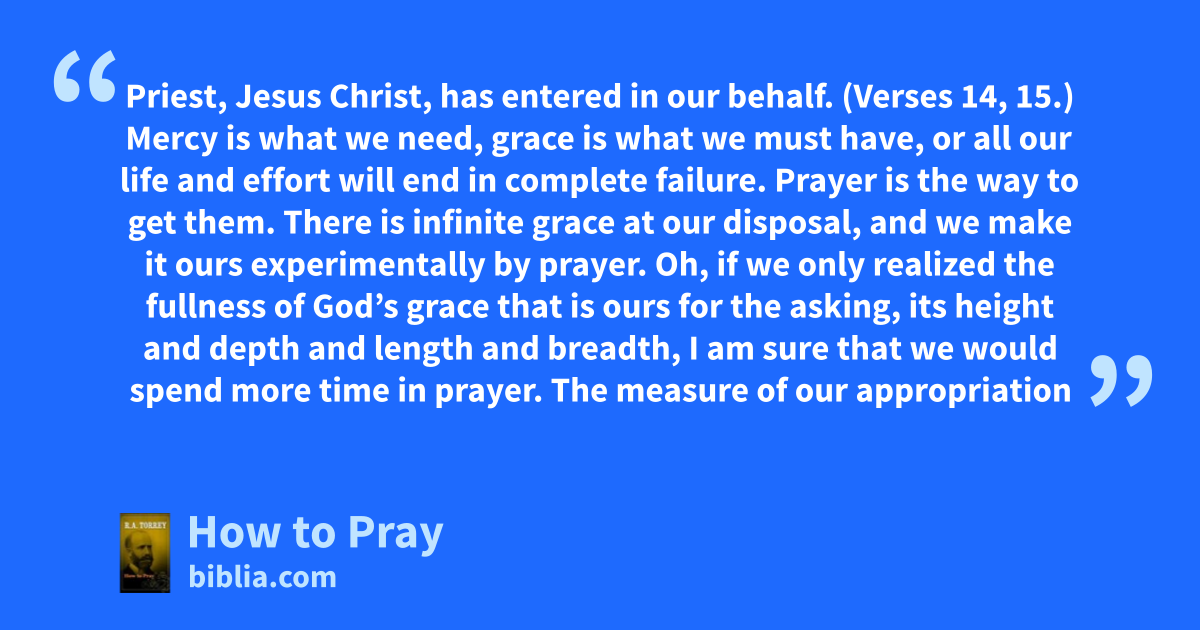 Priest, Jesus Christ, has entered in our behalf. (Verses 14, 15.) Mercy is what we need, grace is what we must have, or all our life and effort will end in complete failure. Prayer is the way to get them. There is infinite grace at our disposal, and we make it ours experimentally by prayer. Oh, if we only realized the fullness of God’s grace that is ours for the asking, its height and depth and length and breadth, I am sure that we would spend more time in prayer. The measure of our appropriation