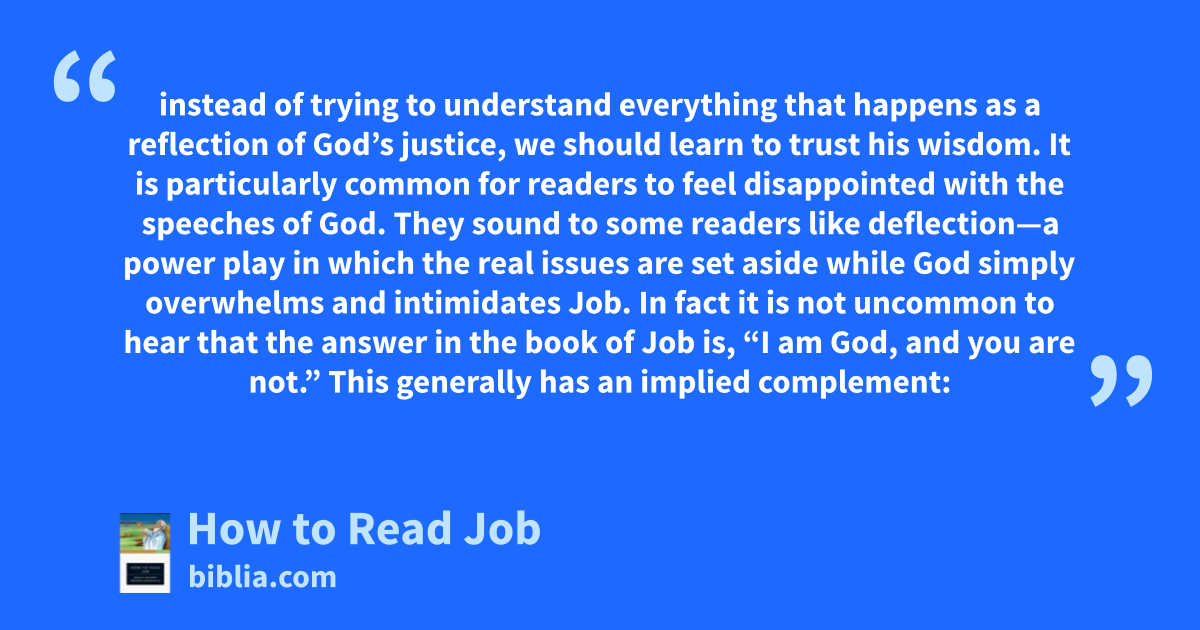 instead of trying to understand everything that happens as a reflection of God’s justice, we should learn to trust his wisdom. It is particularly common for readers to feel disappointed with the speeches of God. They sound to some readers like deflection—a power play in which the real issues are set aside while God simply overwhelms and intimidates Job. In fact it is not uncommon to hear that the answer in the book of Job is, “I am God, and you are not.” This generally has an implied complement: