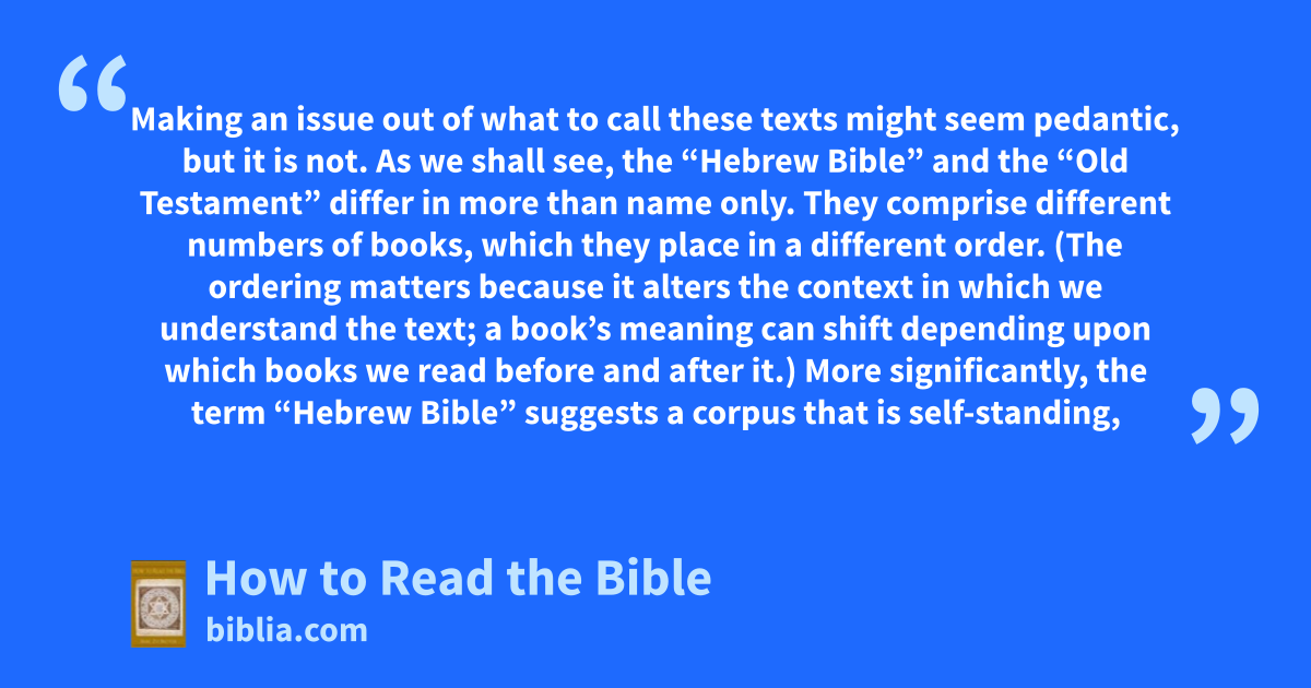 Making an issue out of what to call these texts might seem pedantic, but it is not. As we shall see, the “Hebrew Bible” and the “Old Testament” differ in more than name only. They comprise different numbers of books, which they place in a different order. (The ordering matters because it alters the context in which we understand the text; a book’s meaning can shift depending upon which books we read before and after it.) More significantly, the term “Hebrew Bible” suggests a corpus that is self-standing,