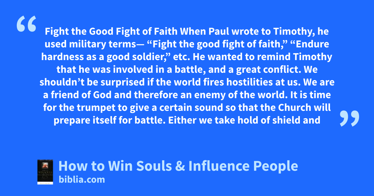 Fight the Good Fight of Faith When Paul wrote to Timothy, he used military terms— “Fight the good fight of faith,” “Endure hardness as a good soldier,” etc. He wanted to remind Timothy that he was involved in a battle, and a great conflict. We shouldn’t be surprised if the world fires hostilities at us. We are a friend of God and therefore an enemy of the world. It is time for the trumpet to give a certain sound so that the Church will prepare itself for battle. Either we take hold of shield and
