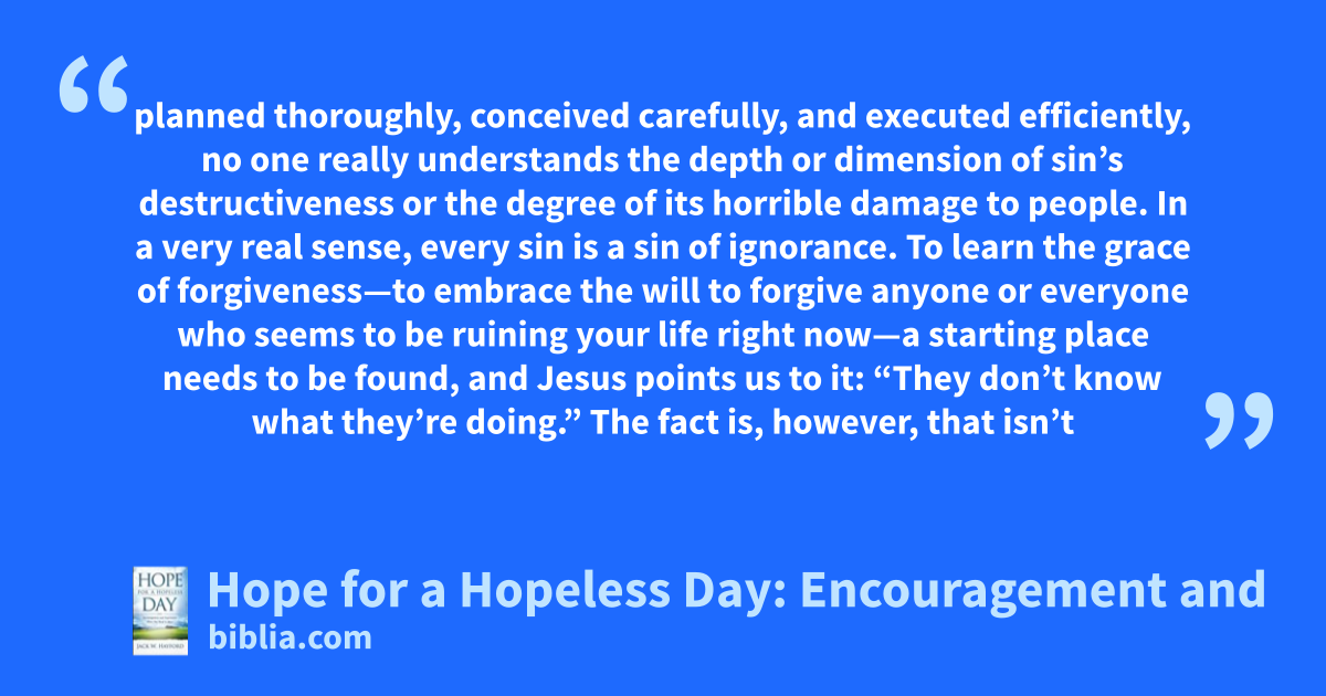 planned thoroughly, conceived carefully, and executed efficiently, no one really understands the depth or dimension of sin’s destructiveness or the degree of its horrible damage to people. In a very real sense, every sin is a sin of ignorance. To learn the grace of forgiveness—to embrace the will to forgive anyone or everyone who seems to be ruining your life right now—a starting place needs to be found, and Jesus points us to it: “They don’t know what they’re doing.” The fact is, however, that isn’t