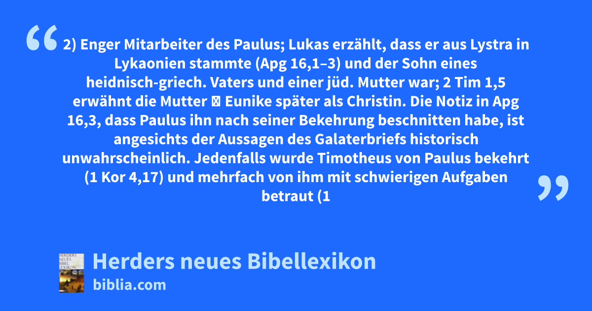 2) Enger Mitarbeiter des Paulus; Lukas erzählt, dass er aus Lystra in Lykaonien stammte (Apg 16,1–3) und der Sohn eines heidnisch-griech. Vaters und einer jüd. Mutter war; 2 Tim 1,5 erwähnt die Mutter ➛ Eunike später als Christin. Die Notiz in Apg 16,3, dass Paulus ihn nach seiner Bekehrung beschnitten habe, ist angesichts der Aussagen des Galaterbriefs historisch unwahrscheinlich. Jedenfalls wurde Timotheus von Paulus bekehrt (1 Kor 4,17) und mehrfach von ihm mit schwierigen Aufgaben betraut (1