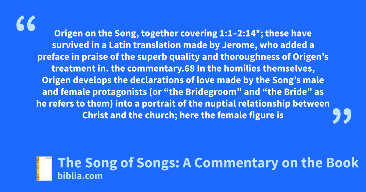 Origen on the Song, together covering 1:1–2:14*; these have survived in a Latin translation made by Jerome, who added a preface in praise of the superb quality and thoroughness of Origen’s treatment in. the commentary.68 In the homilies themselves, Origen develops the declarations of love made by the Song’s male and female protagonists (or “the Bridegroom” and “the Bride” as he refers to them) into a portrait of the nuptial relationship between Christ and the church; here the female figure is