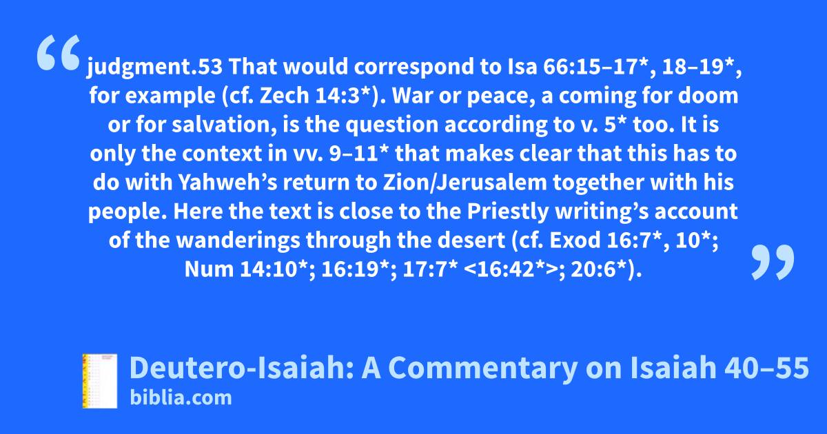 judgment.53 That would correspond to Isa 66:15–17*, 18–19*, for example (cf. Zech 14:3*). War or peace, a coming for doom or for salvation, is the question according to v. 5* too. It is only the context in vv. 9–11* that makes clear that this has to do with Yahweh’s return to Zion/Jerusalem together with his people. Here the text is close to the Priestly writing’s account of the wanderings through the desert (cf. Exod 16:7*, 10*; Num 14:10*; 16:19*; 17:7* <16:42*>; 20:6*).