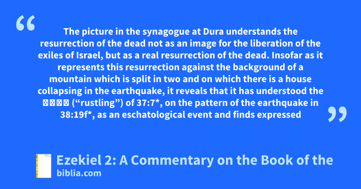 The picture in the synagogue at Dura understands the resurrection of the dead not as an image for the liberation of the exiles of Israel, but as a real resurrection of the dead. Insofar as it represents this resurrection against the background of a mountain which is split in two and on which there is a house collapsing in the earthquake, it reveals that it has understood the רעשׂ (“rustling”) of 37:7*, on the pattern of the earthquake in 38:19f*, as an eschatological event and finds expressed