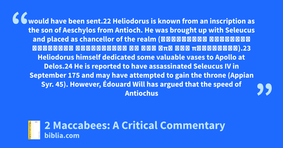 would have been sent.22 Heliodorus is known from an inscription as the son of Aeschylos from Antioch. He was brought up with Seleucus and placed as chancellor of the realm (σύντροφος βασιλέως Σελεύκου τεταγμένος δὲ καὶ ἐπὶ τῶν πραγμάτων).23 Heliodorus himself dedicated some valuable vases to Apollo at Delos.24 He is reported to have assassinated Seleucus IV in September 175 and may have attempted to gain the throne (Appian Syr. 45). However, Édouard Will has argued that the speed of Antiochus