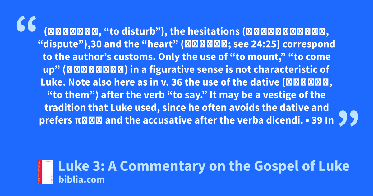 (ταράσσω, “to disturb”), the hesitations (διαλογισμός, “dispute”),30 and the “heart” (καρδία; see 24:25) correspond to the author’s customs. Only the use of “to mount,” “to come up” (ἀναβαίνω) in a figurative sense is not characteristic of Luke. Note also here as in v. 36 the use of the dative (αὐτοῖς, “to them”) after the verb “to say.” It may be a vestige of the tradition that Luke used, since he often avoids the dative and prefers πρός and the accusative after the verba dicendi. ■ 39 In
