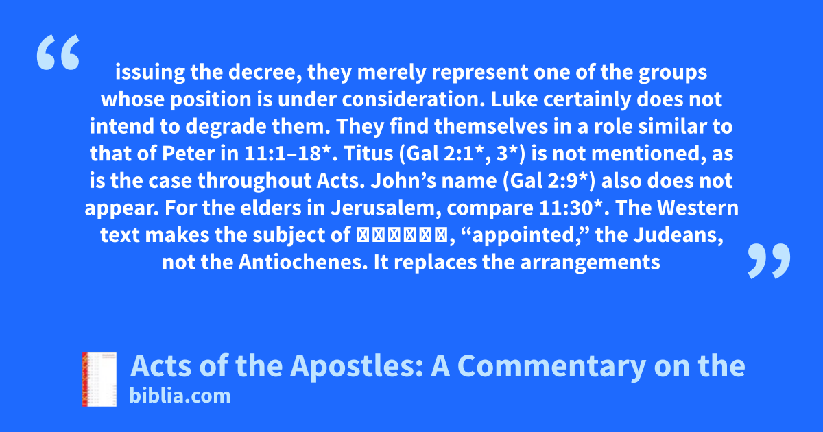 issuing the decree, they merely represent one of the groups whose position is under consideration. Luke certainly does not intend to degrade them. They find themselves in a role similar to that of Peter in 11:1–18*. Titus (Gal 2:1*, 3*) is not mentioned, as is the case throughout Acts. John’s name (Gal 2:9*) also does not appear. For the elders in Jerusalem, compare 11:30*. The Western text makes the subject of ἔταξαν, “appointed,” the Judeans, not the Antiochenes. It replaces the arrangements