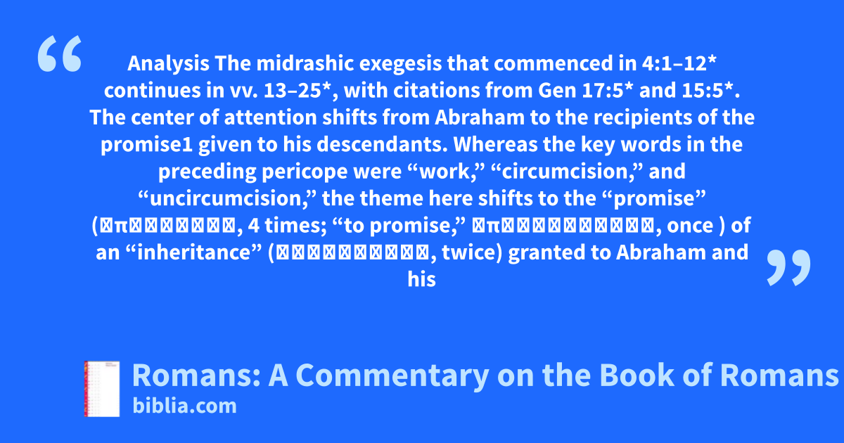 Analysis The midrashic exegesis that commenced in 4:1–12* continues in vv. 13–25*, with citations from Gen 17:5* and 15:5*. The center of attention shifts from Abraham to the recipients of the promise1 given to his descendants. Whereas the key words in the preceding pericope were “work,” “circumcision,” and “uncircumcision,” the theme here shifts to the “promise” (ἐπαγγελία, 4 times; “to promise,” ἐπαγγέλλομαι, once ) of an “inheritance” (κληρονόμος, twice) granted to Abraham and his